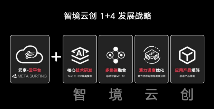 全新的品牌带了全新的业务战略。新品牌揭幕后,王智武正式对外公布智境云创新阶段“1 4”发展战略,即1个平台 4个发展方向。1个平台代表智境云创自研的元享智能云平台,4个方向分别是迈向人工智能的“智”;实现多终端融合,在VR、AR、MR场景构建生态的“境”;构建云算力调度平台,基于云算力、云渲染发力2C市场的“云”。同时,将积极推进海外市场布局,扎根于北京,辐射全球,将技术、产品、应用推广到北美、中东、东南亚等地区。