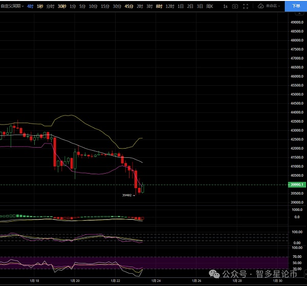 最近几天有点私事要处理,抽不出时间跟大家分析自己的思路,大饼行情在继周末两天的震荡行情后,在昨日午夜跌破了4万关口,**点是来到了39400一线,目前有稍稍收复上去,目前行情均处于下方支撑位附近,币价已有触底迹象,不用过多的追空。牛市多暴跌,而且暴跌之后调整的时间不会很长,这与熊市有很大的不同,当前etf落地,市场需要等待下一个叙事事件出现,大饼的减半在今年4月份,一般也会提前走减半的预期,所以实际上留给市场调整的时间也很有限,大家不要跌了一点就一惊一乍,接着是美联储降息,一旦美联储开启降息周期,那么就是贯穿整个牛市周期的动力引擎,会一层一层将大饼的价格不断往上抬,直到**的疯牛,周期结束,进入下一个循环。我看的是整个周期的叙事逻辑,不在于每天上下几个点的波动,只要确定牛市基本面没变就行,你们要做的就是拿住筹码,躺平,不要乱折腾,牛市很多人亏的原因就是拿不住,把低价**的廉价筹码在每天的波动中给折腾没了,这是致命的,眼光不要局限在短期上,因为大周期向上,你根本没必要慌!废话不多说了,咱们看看今日盘面走势情况。