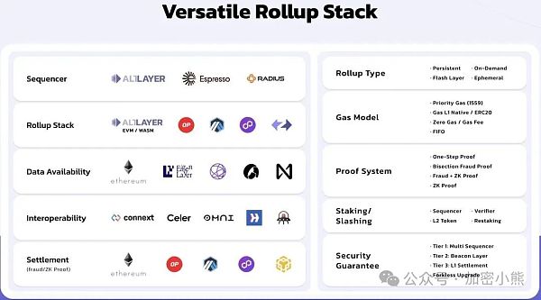 此外,AltLayer 还整合了Restaked Rollups的创新理念。一方面,AltLayer通过采用Rollup(可从**Rollup堆栈中衍生,如OP Stack、Arbitrum Orbit、Polygon CDK、ZK Stack等),为这些Rollups提供了增强的安全性、去**化和互操作性。