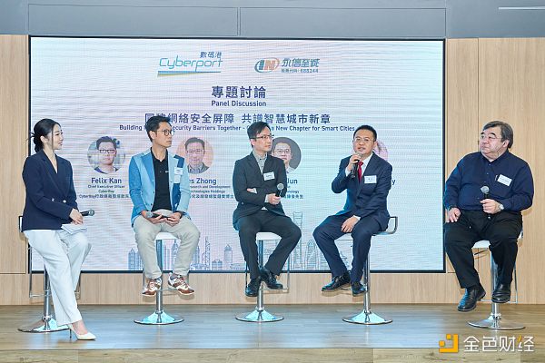 签约仪式后,永信至诚总裁陈俊联同数码港网络安全的伙伴企业进行专题讨论,包括科联系统集团产品研究及开发总监钟实博士、Network Box 董事总经理 Michael Gazeley,以及CyberBay 行政总裁简培钦,探讨如何提升网络安全,为创科应用提供更安全有利的网络环境,让科技应用深入社会运作,推进建设智慧城市。