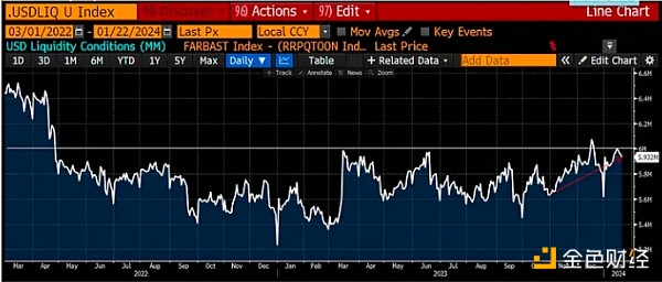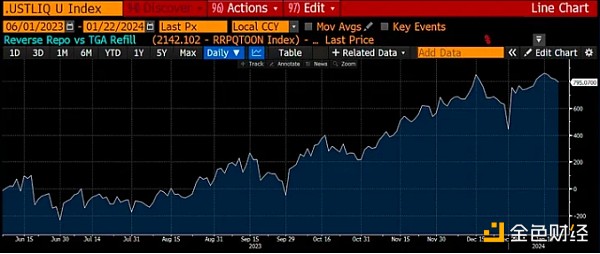 该图表是该指数的子组成部分,是 RRP 和 **A 余额变化的净值。 自2023年6月美国政府通过预算以来,已新增近8000亿美元的流动性。