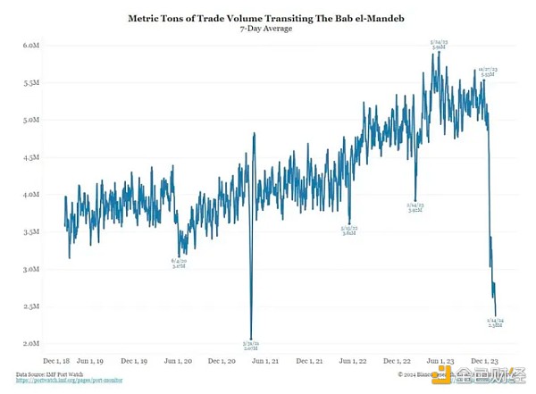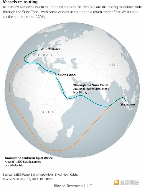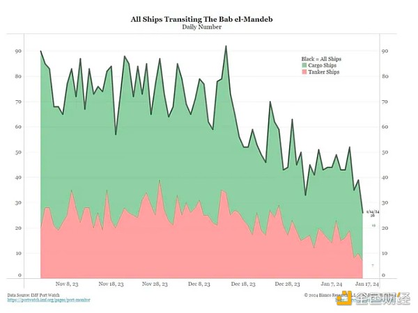 这种改道影响了全球 20% 到 30% 的运输,并增加了大量的时间和费用。 对于通货**统计学家来说,在其他条件相同的情况下,**乘船旅行的东西都会变得更加昂贵。 鉴于通货**的运行具有相当大的滞后性,如果这种情况持续下去,其影响将在几个月后才会显现。 尽管市场对美国和其他地区同比通胀数据下降感到高兴,但这可能是一场代价高昂的胜利。