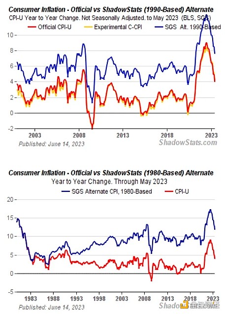 目前的消费者价格指数(CPI)计算方法是Fugazi。 如果我们回到 1980 年或 1990 年的 CPI 计算方法,实际通胀率约为 10%,而你在新闻中读到的通胀率为 3%。