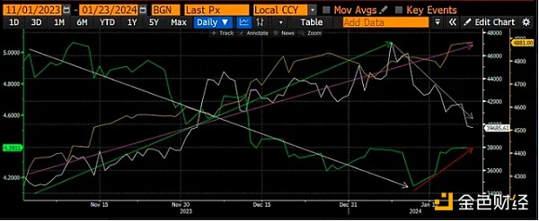 我指的市场是标准普尔 500 指数和纳斯达克 100 指数,它们都创下了历史新高。 但一切并不顺利。 美元流动性方向的真正烟雾警报——比特币——正在发出警告信号。 美国现货ETF推出后,比特币已从48,000美元的高点跌至40,000美元以下。 与比特币的局部高点一致,2年期美国国债收益率在1月中旬触及4.14%的局部低点,目前正在上涨。