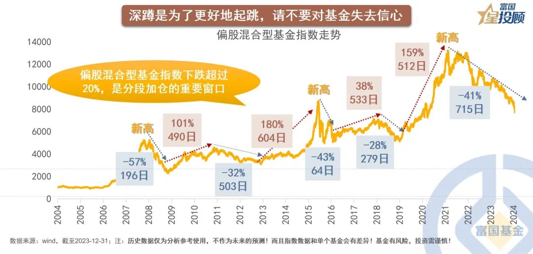 自2005年以来,偏股混合型基金指数的年化收益达到12%,并在市场波动中不断创出新高、穿越牛熊周期,将一个个上证指数的历史高点踩在脚下。回顾过往,每一次偏股混合型基金指数回调超过20%,都是分段加仓或增加定投的历史性窗口期。