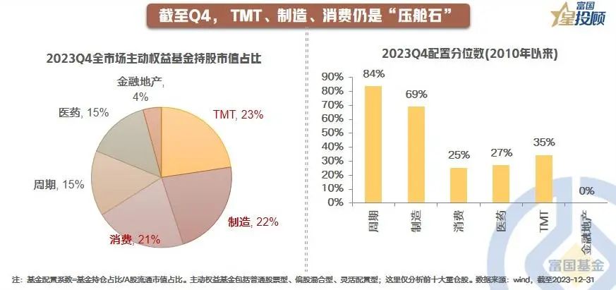 截至Q4,TMT、制造、消费仍是主动权益基金持仓的“压舱石”,合计占比66%。从2010年以来的配置分位数看,其中,对周期的配置位于极高水位,为84%;对制造的配置位于较高水位,为69%;对TMT、医药、消费的配置位于较低水位,分别为35%、27%、25%;对金融地产的配置创下历史新低。