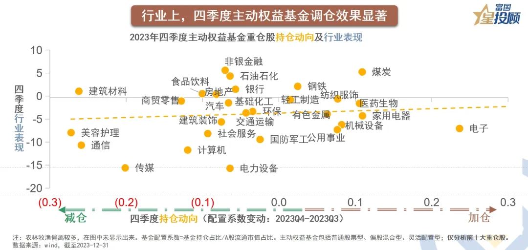 从四季度主动权益基金重仓股的行业增/减配情况,以及行业的超额表现看,呈现**的正相关。这也说明,基金经理有通过“行业调仓”来应对市场波动,且调仓的收益贡献整体是正向的。