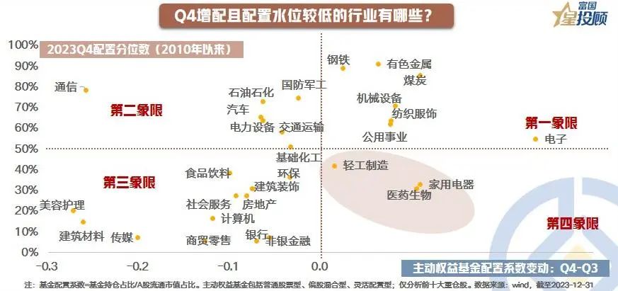 若是综合考虑四季度加仓动向及配置分位数,则图中右下角区域的行业更值得关注,包括医药、家电、轻工,属于公募在加仓,且仍有较大加仓空间的方向。