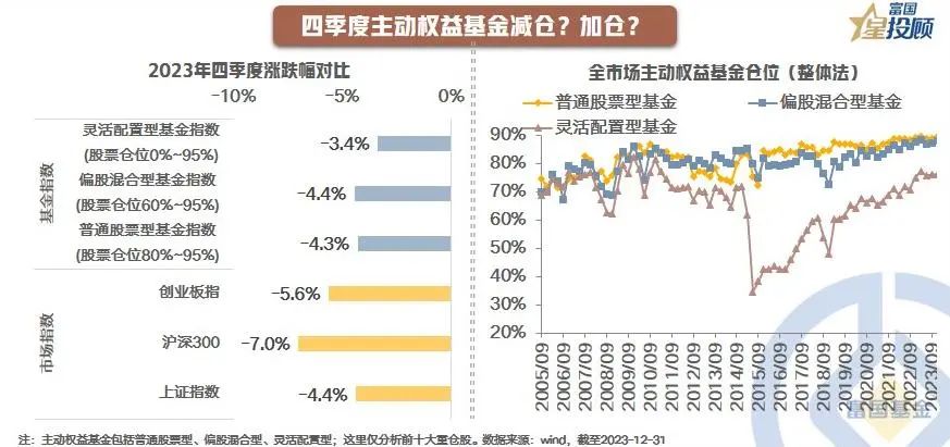截至Q4,普通股票型、偏股混合型、灵活配置型的股票仓位,分别比三季度末提升0.6、0.7、0.2个百分点,而且整体仓位仍位居历史较高水平。