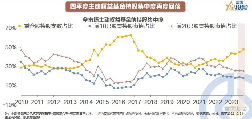 四季度,主动权益基金的重仓股支数在持续增加,而持股集中度在继续下滑。这说明基金经理有通过“挖掘新个股 持股分散化”的方式来应对市场波动,寻找更多结构性机会。
