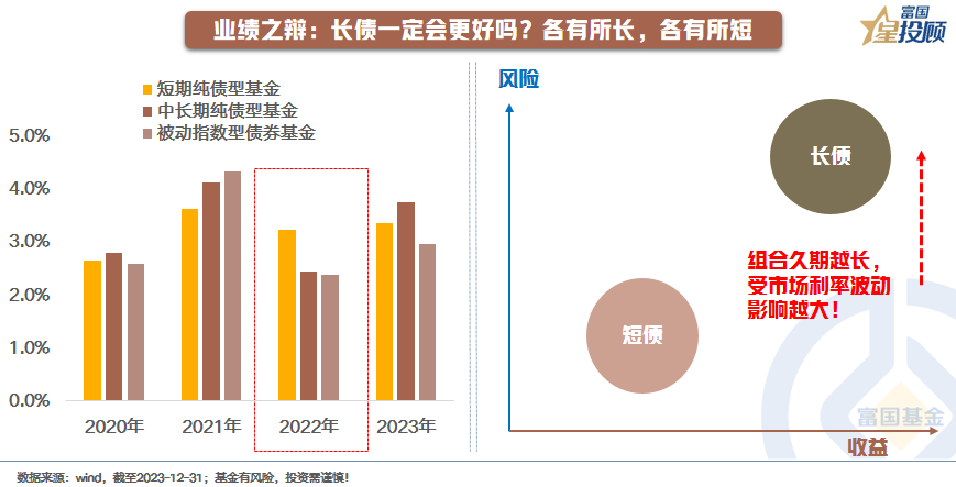 一是,从风险收益特征来看,长债潜在的风险和收益大于短债。因此,不同风险收益特征的人会选择不同的产品。二是,如果风险收益特征没有明显差异,那么,短债和长债的区别就体现在宏观环境的匹配性上。因此,可以看到,虽然大多数年份长债会比短债收益高一些,但有时短债收益也会比长债高,典型如2022年。