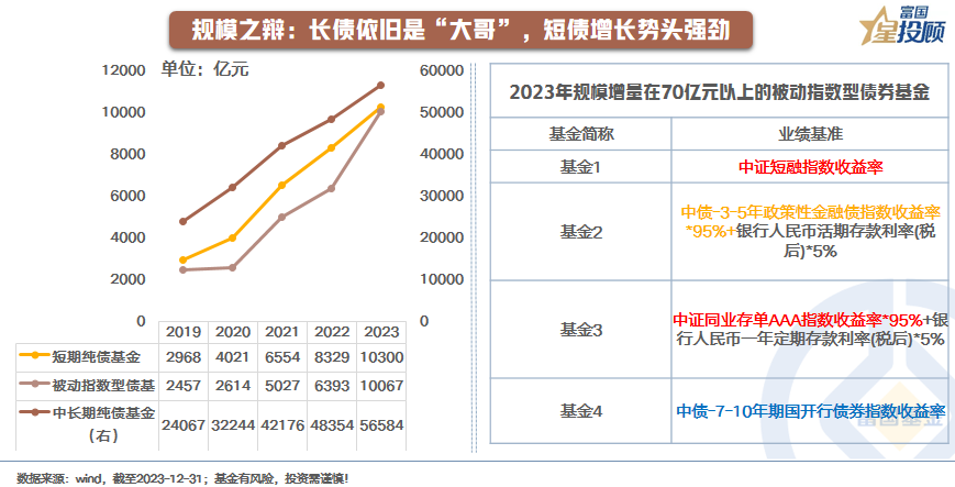 3)规模之辩:长债基金依旧是“大哥”,短债基金2023年规模突破万亿
