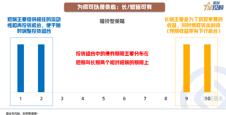 既买长债又买短债的行为也被称作哑铃策略,买长债的原因在于:长端的票息本来更丰厚,同时市场对经济的预期较弱(意味着短期长债利率上行风险较小),并对未来降息有期待。买长债可以借助久期的力量,博弈利率下行带来的债券价格上涨的机会。买短债的原因在于:短端的流动性非常好,便于随时调整投资组合。