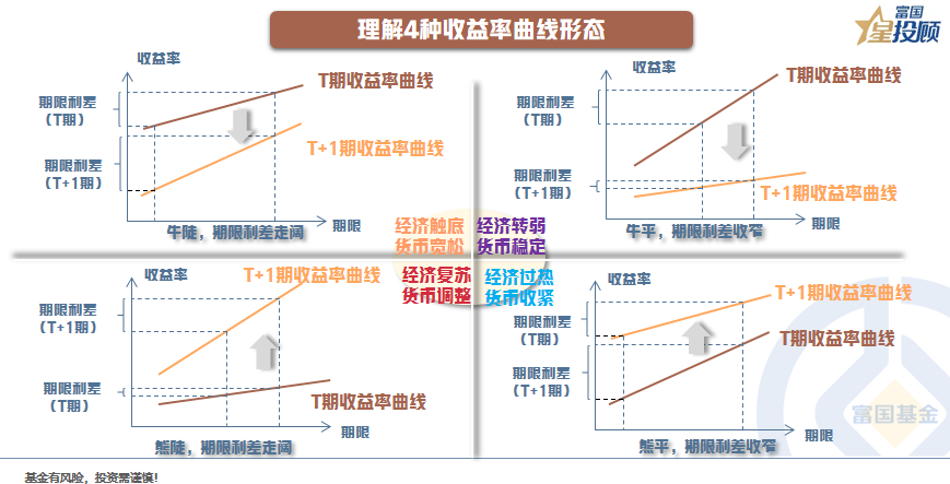 连接长端和短端的收益率曲线,在不同经济环境下有不同的形态,具体可以分为以下4种:
