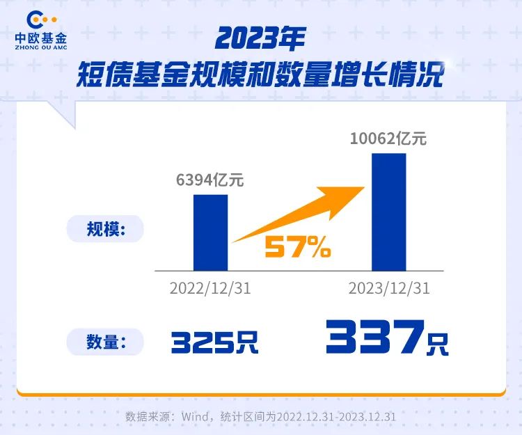 去年市场震荡下,短债基金成为投资新宠。根据Wind数据统计,2023年短期纯债型基金份额增长明显,截至2023年底,合计规模10062亿元,相比2022年底的6394亿元,同比增幅超57%。