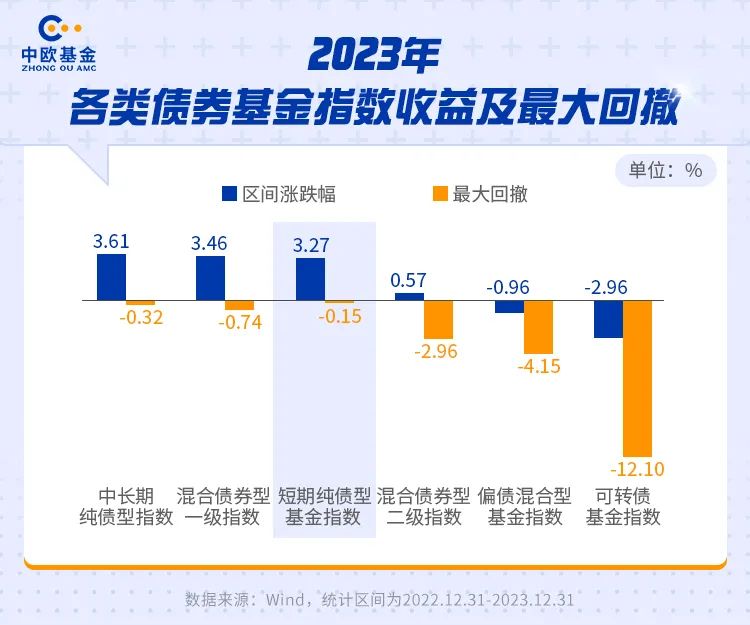 2023年,债券基金整体表现不俗。Wind数据显示,中长期纯债型基金指数、混合债券型**指数、短期纯债型基金指数、混合债券型二级指数均取得了正收益。其中,短期纯债型基金指数在各类债券指数中**回撤**,仅为-0.15%。相较于所取得的3.27%的全年收益而言,短期纯债型基金指数的投资性价比突出。