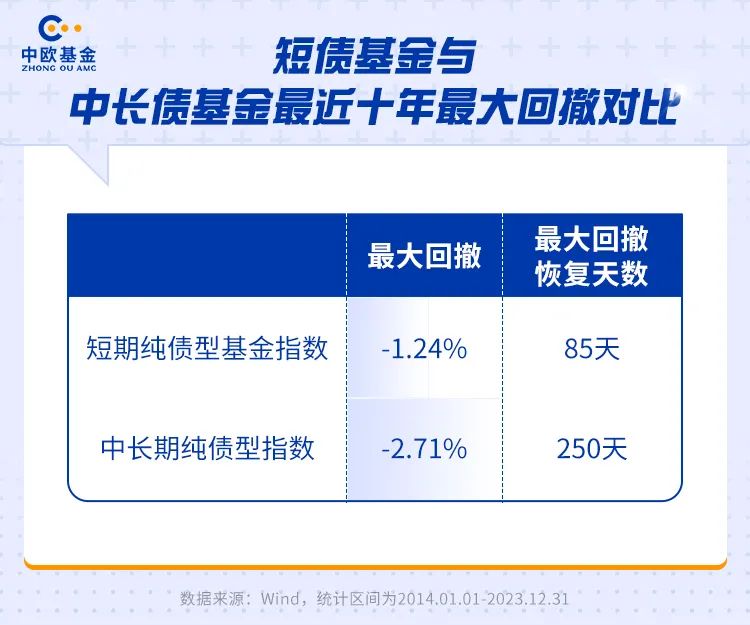 此外,与中长期纯债基金相比,短债基金投资的债券资产久期相对更短,受市场利率波动的影响较小。虽然与中长期纯债基金相比,短债基金长期收益略低,但整体**回撤相对更小,**回撤的回复天数也明显快于中长债基金。