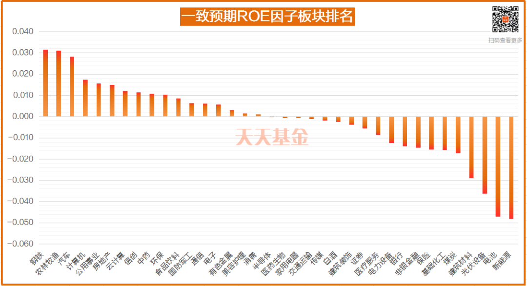 行业因子采用行业成分股因子的中位数,按照上述计算公式,截至2024-01-11 一致预期ROE因子板块前三名分别是钢铁、农林牧渔和汽车,且近一半的板块预期ROE季度环比有所改善。(比较范围在天天基金上线的36个板块中)