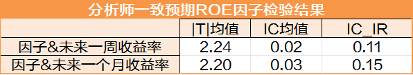 从检验结果来看,分析师一致预期ROE因子t值大于2,说明因子是显著的。IC均值大于0,说明分析师一致预期ROE因子越大,股票未来一周或一个月的收益率都会越高。