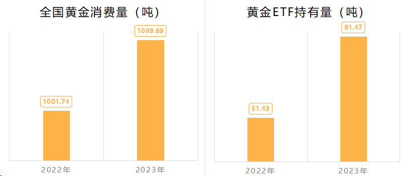 据统计,截至2023年末,我国黄金消费量为同比增长8.78%,**黄金ETF持有量同比增长19.53%。