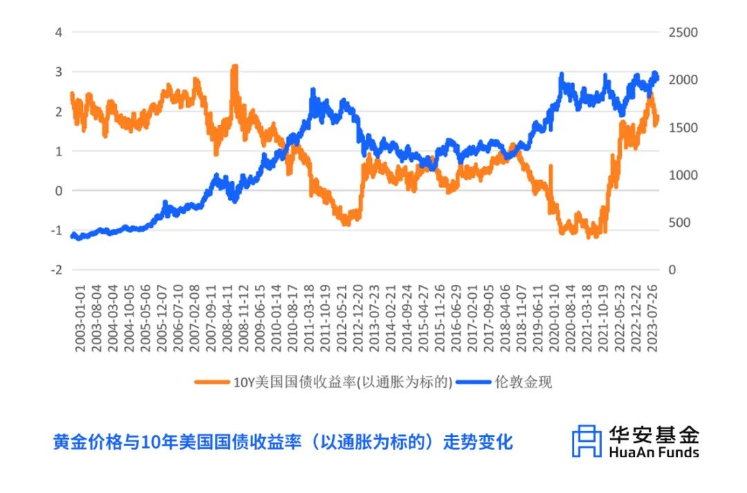 从走势图能看出,黄金价格和美债实际利率之间存在较明显的负相关关系。