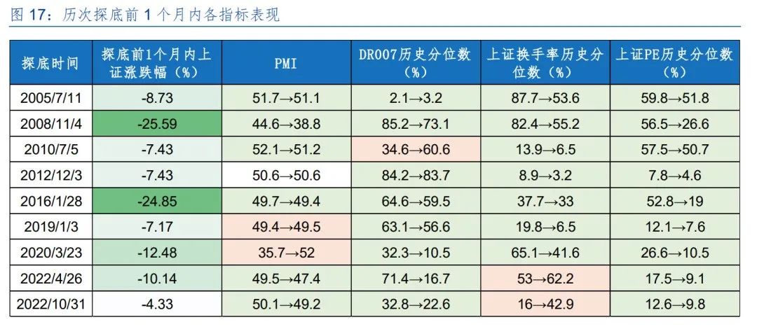根据华金证券的研报,市场探底成功的核心条件是强力的政策或高层表态扭转预期,低估值和流动性宽松也是必要条件。“如2005/7的股权分置改革、2008/11的”四万亿“、2010/7的欧债危机缓解、2012/12的经济工作会议、2016/1的供给侧改革、2019/1的民营企业家座谈会、2020/3的**疫情控制、2022/4的上海疫情控制、2022/10的防疫放松。”