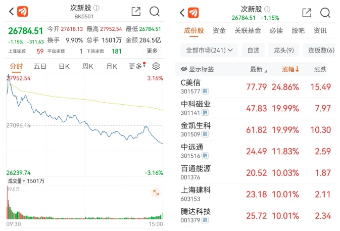 这个好消息也并非对市场没有作用,融券受限是直接利好次新股的,昨天次新股受影响大幅上涨。次新股C美信涨超20%,中科磁业、金凯生物等20CM涨停,不过随着午后指数走弱,次新股板块**也是以下跌收盘。
