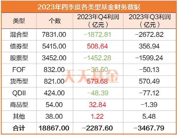 根据天相投顾数据显示,公募基金去年四季度共亏损2287.6亿元,计算全年的话,公募基金2023年全年共亏损4346.78亿元。如果算上2022年整体亏损1.45万亿元,意味着公募基金历史上**出现连续两年亏损。(数据来源:天相投顾,统计口径为“本期利润”,即基金当期利息收入、投资收益、其他收入扣除相关费用和信用减值损失后的余额,加上本期公允价值变动收益,不代表真实收益,历史收益不预示未来表现,不作投资推荐)