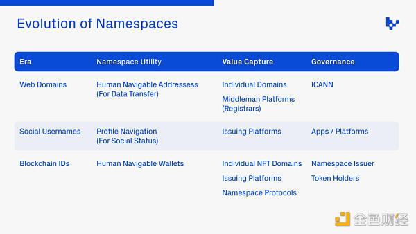随着命名空间发行者的兴起,加密消费者应用程序将有机会创建自己的原生命名空间,但这一次,我们将能够拥有社交用户名或对根命名空间(例如 ENS)进行治理。有了这种能力,将为**加密消费者应用程序及其早期用户带来利润丰厚的机会。