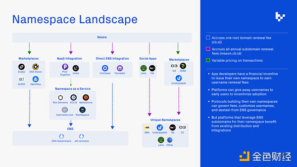 另一方面,Lens和Yat等项目选择通过创建自己的命名空间协议来发行用户名,与 ENS 生态系统分离。这些独特的命名空间具有与 ENS 子域名类似的价值主张,但具有更大的协议灵活性、第三方发行人的自主权,以及从命名空间发行和年度续订费中赚取费用的独特优势。