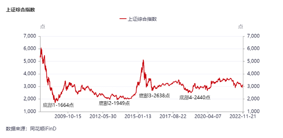 将时间线拉回至2008年,我们可以从上证综指的走势图上,清晰的看出四次“底部”。