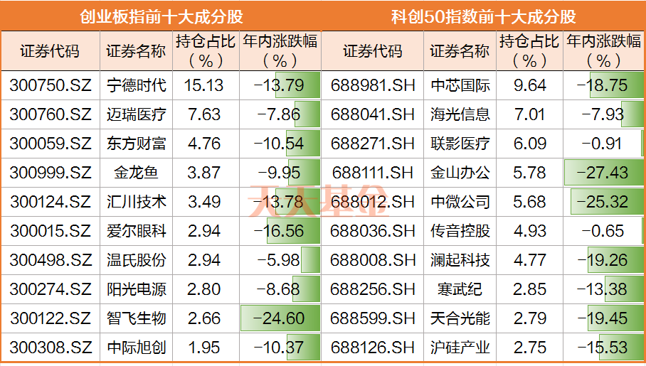 一方面,创业板指的权重板块医药、新能源、科技板块是最近下跌的主力军。**大重仓股宁德时代昨天下跌,创了2020年12月以来新低,其他个股年内跌幅也不小。科技股的下跌也导致科创50指数跌幅居前。