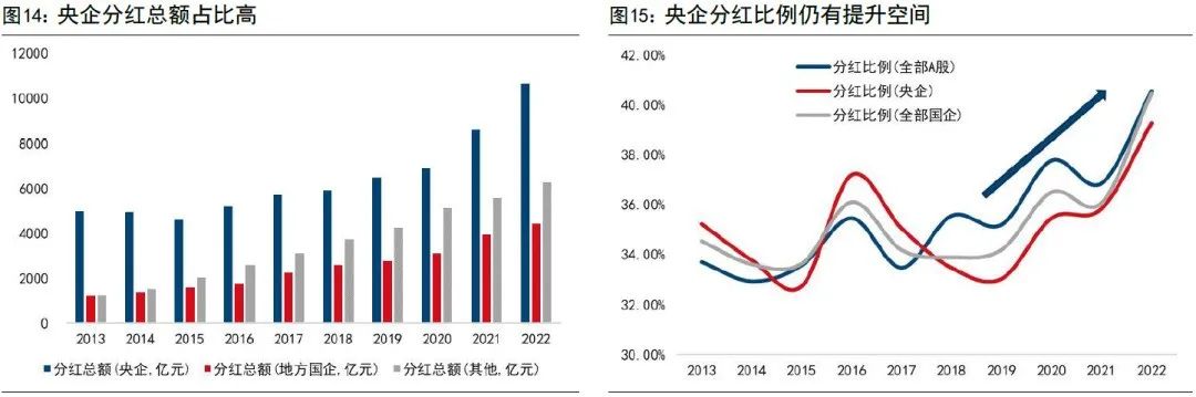 国信证券研报指出,“国央企是A股市场的分红主力,但比例仍有提升空间。从分红总额和分红比例上看,央企仍是A股分红主力,近五年来分红比例持续提升。”