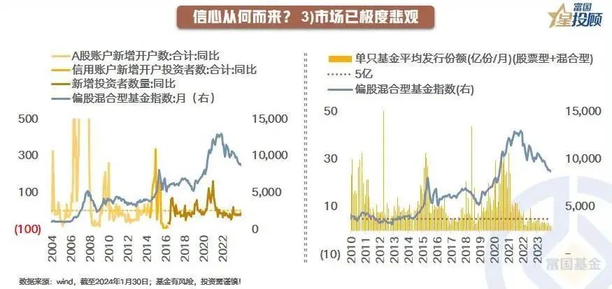 从新增投资者/开户数同比增速看,目前处于“冰点”水平,且已持续2年多,月平均增速-20%,反映出市场确已到了无人问津的阶段。从新基金发行看,2023年12月单只基金的发行规模仅1.75亿份,位于2005年以来的0.45%分位。回顾历史,基金发行遇冷往往是底部特征之一,尤其是当单只基金的月均发行份额低于5亿份,是一个比较显著的信号。