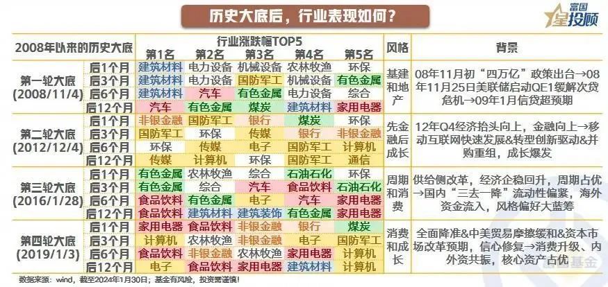 每一轮走出底部的驱动力各有不同。2019年的核心是**政策的转向,从开年降准,到民企纾困;2016年的核心是开年熔断股灾“3.0”跌出价值,叠加供给侧改革下的基本面修复;2012年的核心是经济复苏的验证;2008年的核心是“四万亿”投资。整体而言,政策力度和经济预期好转是“破局”的核心。