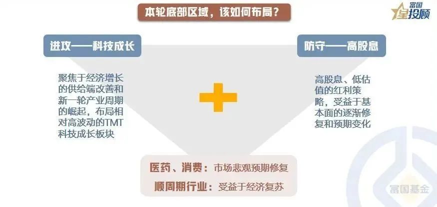可以采用“三角形”配置。防守侧,配置高股息、低估值的红利策略,受益于基本面的逐渐修复和预期变化;进攻侧,可以聚焦于经济增长的供给端改善和新一轮产业周期的崛起,布局相对高波动的TMT科技成长板块;中间层以稳健为主,布局受益于市场悲观情绪修复的医药、消费,以及受益于经济复苏的顺周期行业。