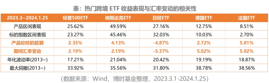 如下表所示,2023年3月以来,海外资产追踪的指数型产品普遍取得不错的收益表现,但是也可以明显发现,产品较标的资产之间的收益表现与期间的汇率变动存在明显关联,这可能也对应着部分投资者选择境外资产以对冲汇率波动的需求。