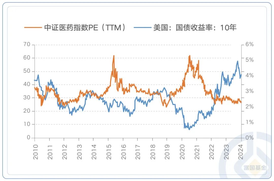 作为全球无风险资产定价的锚,十年期美债收益率已经从高点5%跌倒了如今的4.1%。对比十年期美债收益率和中证医药指数估值,可以发现,十年期美债收益率和中证医药指数估值呈较为显著的负相关关系,十年期美债收益率下行时,医药行业估值有望抬升。