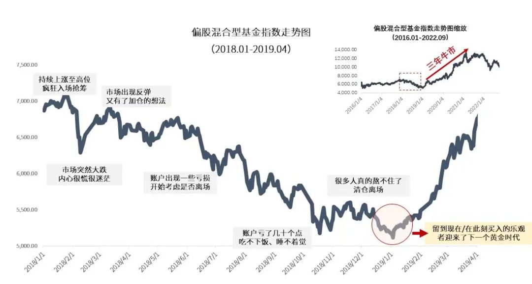 投资的过程时常是反人性的,投资者极易在市场过热时陷入乐观,高位重仓买进甚至“梭哈”;又在市场低位时过度悲观,害怕深不见底选择**持有现金。