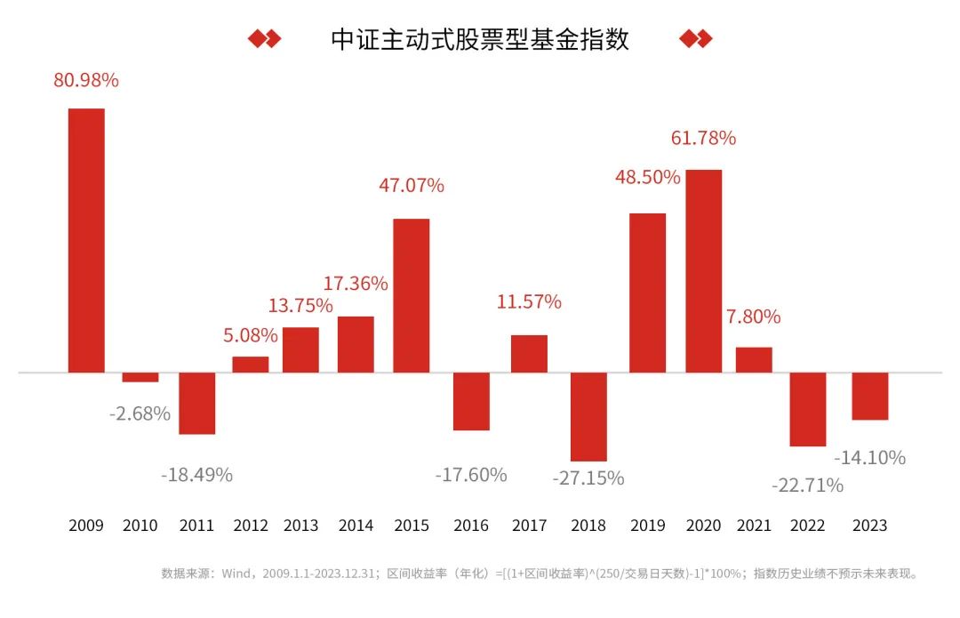 在2009-2023年这15年间,中证主动式股票型基金指数年化收益率为8.78%,累计收益率达241%。但是,这并不代表其中的每一年都是赚钱的。这是因为年化收益率是一个平均的概念,如果我们在2010、2011、2016、2018、2022、2023这些年份的年初买入、年末卖出,不但赚不到钱还会亏损。