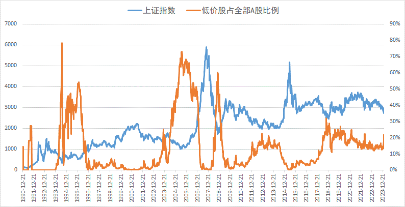 我们以周为单位,统计了1990年A股开市以来低价股占比的变化情况,同样和上证指数同期走势做了对比: