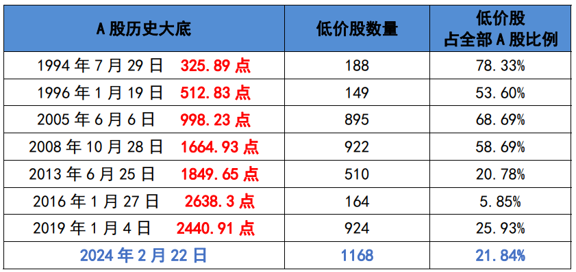 当前低价股的**数量高于历史上历次底部;