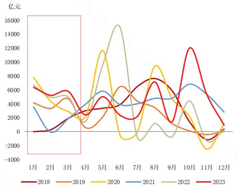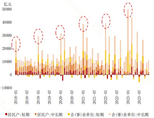 (2)信贷“开门红”影响商业银行融出资金能力:为促进实体经济复苏、推动主体信用扩张,2018-2023年商业银行信贷“开门红”态势增强,1月金融机构新增**规模屡次突破前高,结构上中长期信贷较高。但对商业银行来说,增加**意味着消耗存放在央行的存款准备金(如果不降准),短期向市场融出资金的能力和意愿相应减少,从而对市场流动性造成阶段性冲击。