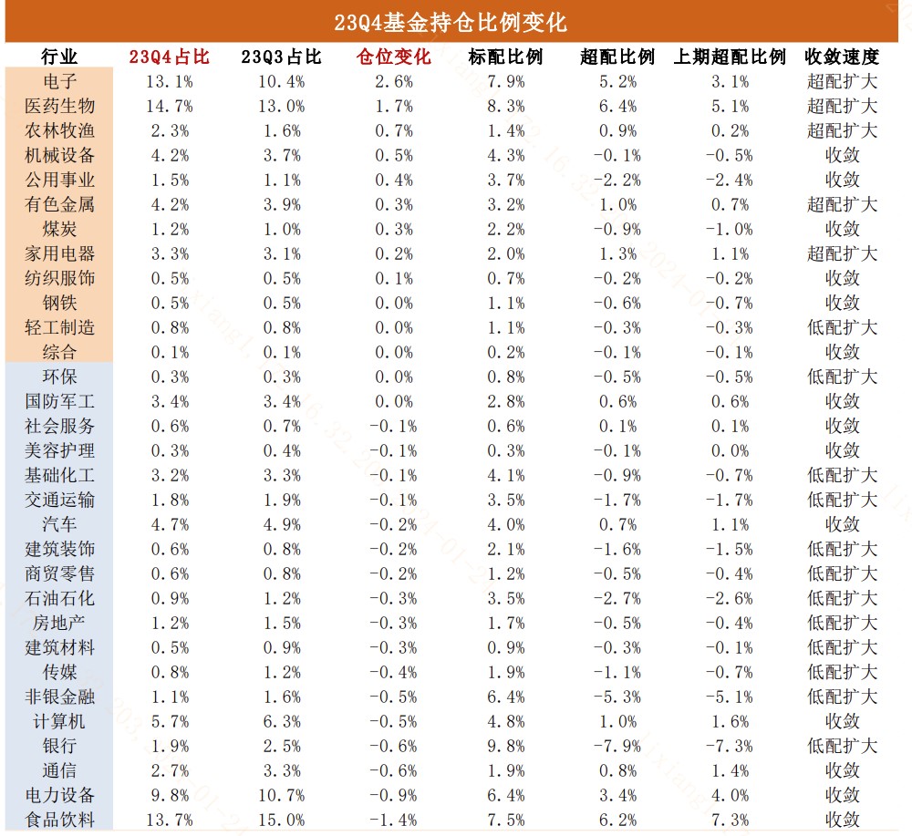 (3)行业配置上,公募基金明显超配电子、医药,对金融地产和消费减持力度较大。申万**行业来看,2023年四季报公募基金主要加仓的方向是电子、医药生物、农林牧渔和机械设备,名义仓位均提升0.5%以上。剔除股价变化后,结论维持不变,实际仓位增加最多的仍然是电子和医药生物,仓位分别上升1.5%和1.0%。