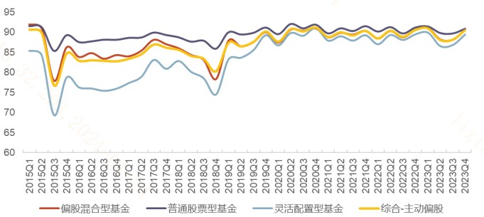 (2)近期公募基金四季报披露。其中主动偏股仓位也有所回升,体现内资机构整体对权益资产的认可度。截至2023年12月31日,主动偏股基金的股票仓位中位数为90.41%,处于2015年以来的83.7%的分位数水平,位于2019年以来76.1%的分位数水平。偏股混合型、普通股票型、灵活配置型股票仓位较上季度末呈现回升。