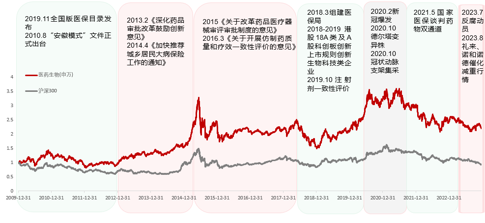 以2009年为分界点,在此之前,行业处于秩序构建和政策探索试点期,医药行业尚不发达,行情也以大盘拉动为主;在进入秩序改革期后,医药行业发展迈入新阶段。