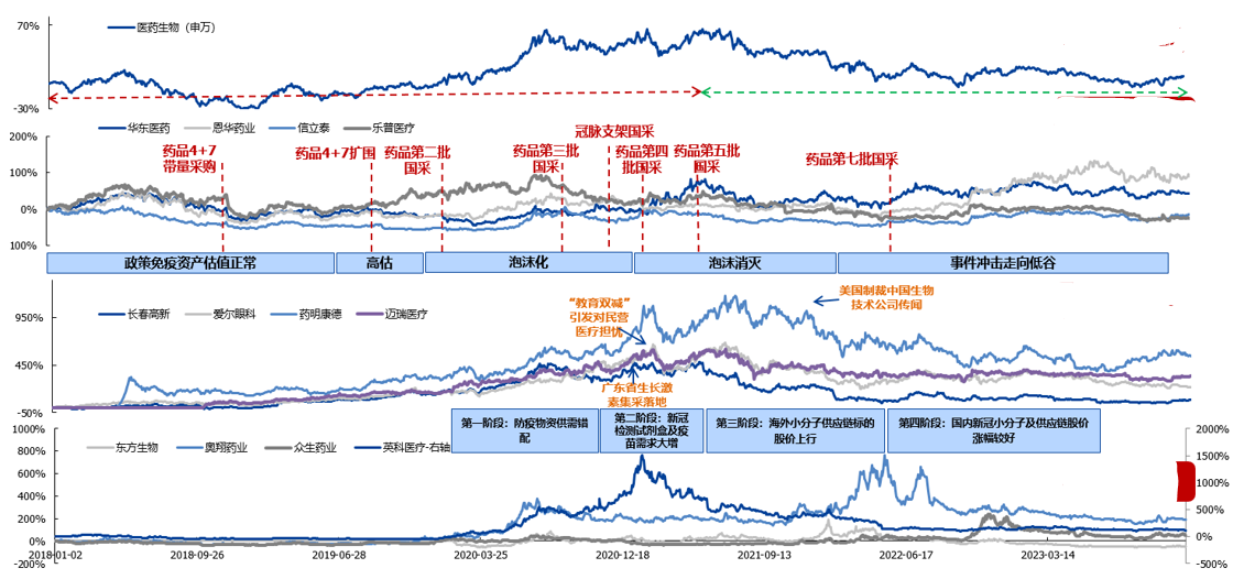 2018年以来新冠疫情影响回顾 & 医药生物板块及相关代表公司涨跌幅走势