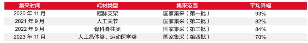 随着可集采品种的减少和集采规则的温和,医药行业内部衍生出政策集采为代表的药品调整也进入了尾声。近期高值耗材集采规则更加完善,企业中选率高,产品需求量大,且整体降价幅度温和。11月30日,**组织高值医用耗材联合采购办公室发布《**组织人工晶体类及运动医学类医用耗材集中带量采购拟中选结果公示》。集采内容涉及运动医学类耗材,标志着我国基本实现骨科耗材集采全覆盖。