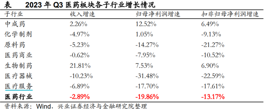 细分板块业绩来看生物制药的业绩韧性较强。2023年第三季度医药板块各子行业(按申万**行业分类)的表现,收入增速为生物制药>中成药>医药商业>化学制剂>原料药>医疗服务>医疗器械;扣非归母净利润增速为:生物制药>中成药>化学制剂>医药商业>医疗服务>原料药>医疗器械。