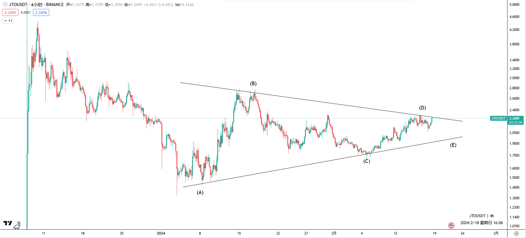 JTO:三角收敛到末端,观察是否在E点有进场机会。